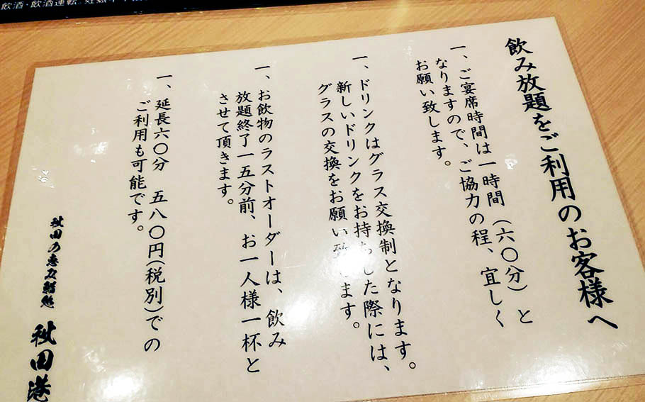 飲み放題の注意書き。