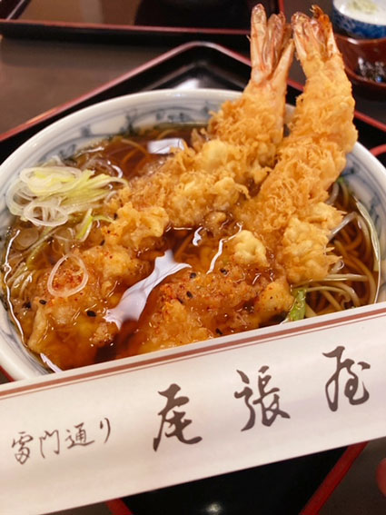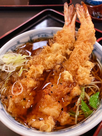 本かつお節のつゆ、独自に仕入れたゴマ油で揚げたエビ天ぷら、最高級国産のそば粉で打つコシのあるそばの三位一体は、コクがあってもさっぱりとしたあと味。